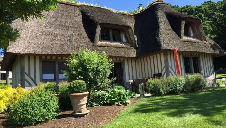 Séjournez près de Honfleur, dans cette location de vacances 4 étoiles, agrémentée d'une piscine couverte et chauffée. Avec son toit en chaume et ses pans de bois, ce gîte se fond dans un décor de carte postale. La piscine couverte et chauffée (du 20 mars à octobre), commune à deux autres gîtes, et la vue imprenable sur l'estuaire de la Seine vous séduiront. Vous pourrez profiter d'un jardin privatif de 3 000 m² sur une propriété de 15 000 m².