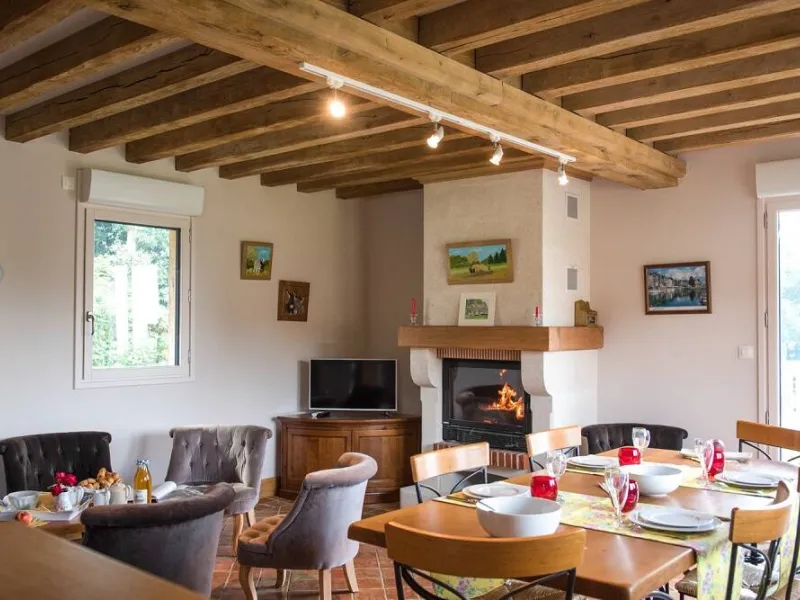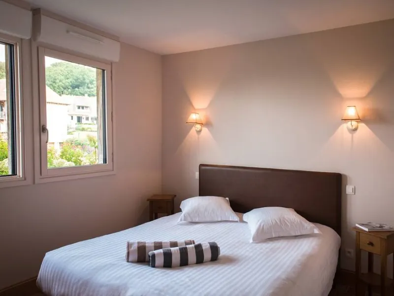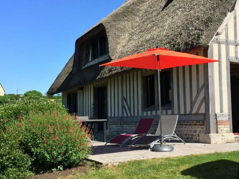 Profitez d'un séjour 4 étoiles dans ce gîte aux prestations de choix situé près de Honfleur et agrémenté d'une piscine couverte et chauffée.Pans de bois et toit de chaume pour cette maison de construction traditionnelle ouverte sur l'estuaire de la Seine et le Pont de Normandie. La décoration raffinée et le confort général vous réservent un séjour serein et détendu. Sur place, piscine couverte et chauffée (du 20 mars à octobre), commune aux 2 autres gîtes. Pour votre confort, le ménage, les draps ainsi que le linge de toilette, et le bois sont inclus dans le prix. RDC : entrée, séjour avec espace cuisine, chambre (1 lit 180x200 cm séparable,), salle d'eau, WC. ÉTAGE : 2 chambres (2 lits 180x200 cm séparables), salle d'eau, WC. A noter, le Domaine propose 2 autres gîtes de 6 et 8 personnes sur place.